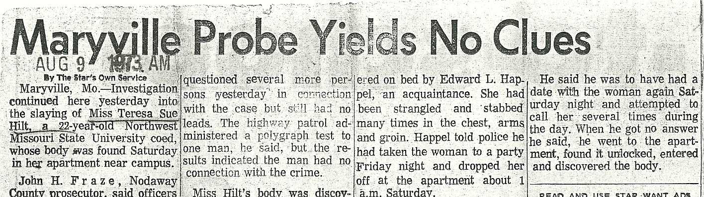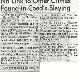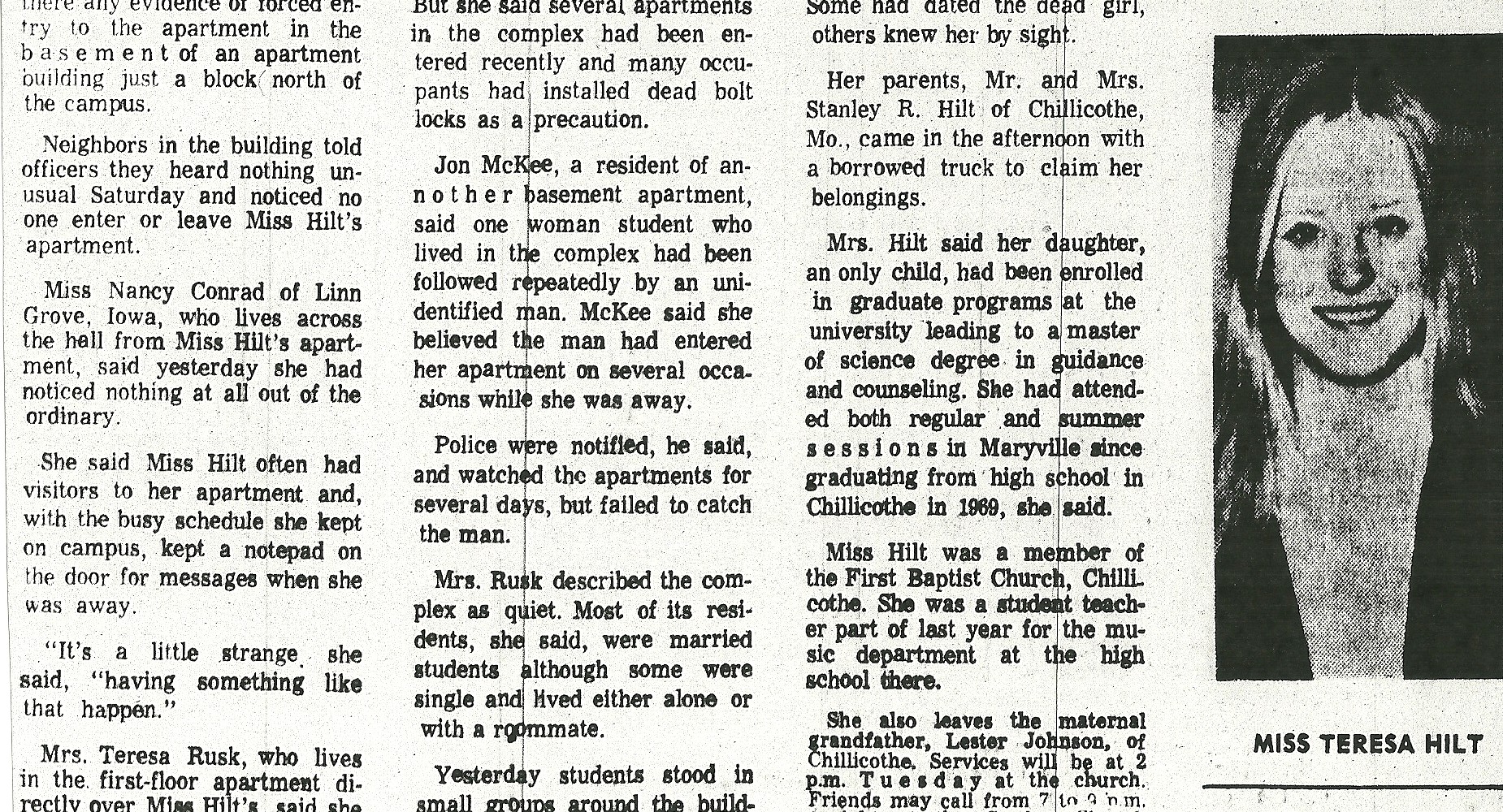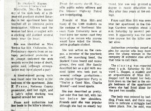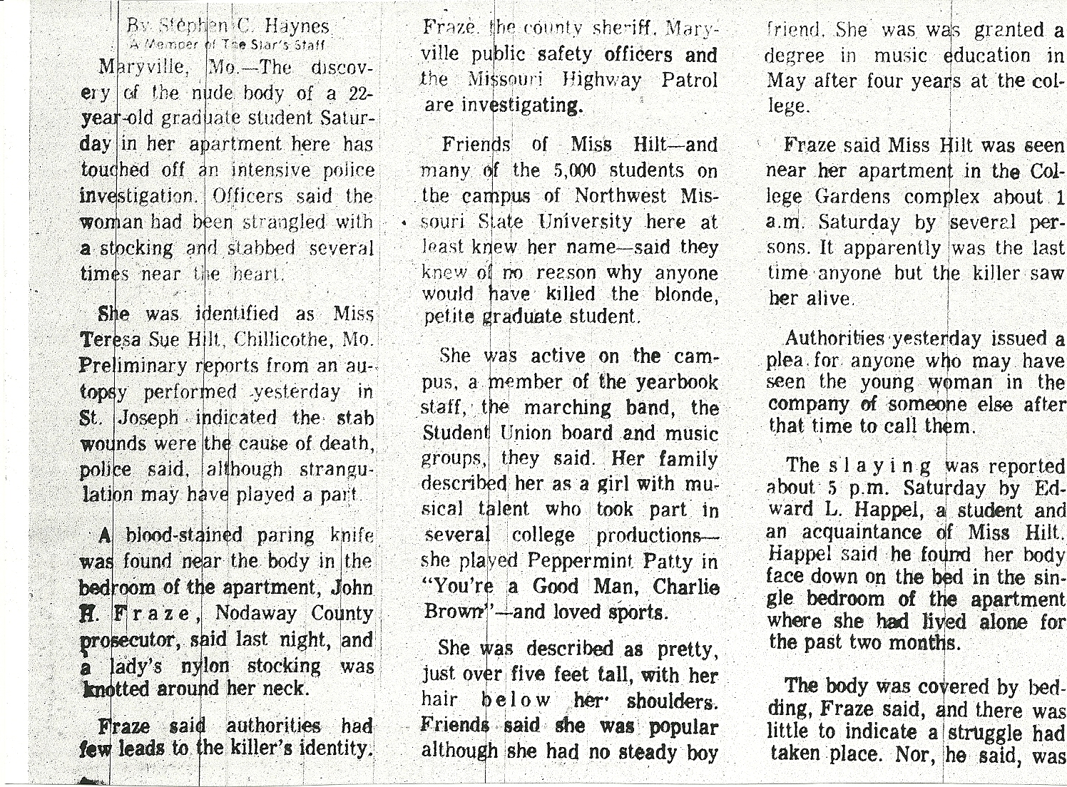“College Coed Found Slain In Maryville Apartment”Kansas City Times, August 6, 1973